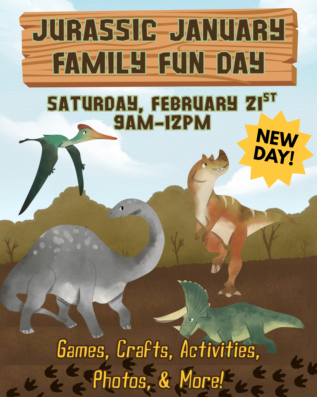 Looking for something to do to beat these winter blues? Join us as we embark on a new adventure as the library transforms into Jurassic Park with the help of our dinosaur friends! Come along with our Dinosaur Rangers and see your favorite dinosaurs from 60 million years ago! Learn some cool facts about all of the dinosaurs as you play games, do crafts, and participate in fun dino themed activities. Dino Wrangler Maddie can’t wait to see you there to have a dino-mite time!
